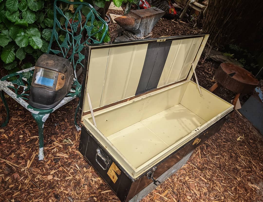 Circa WW1 well made metal trunk excellent condition for age, original travel stickers On His Majesty’s service HMS Arial £75.00 Collection or delivery.