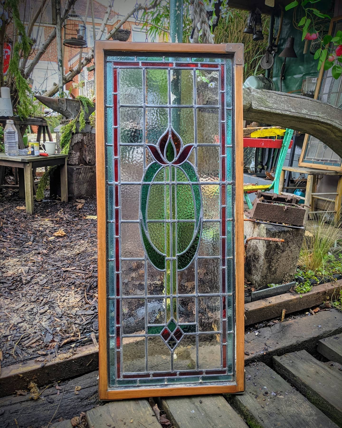 Quality antique stained glass pane in original frame ironwork detailing excellent patina five different colours measurement approx 46 inches high 19 in wide looks great (SOLD)