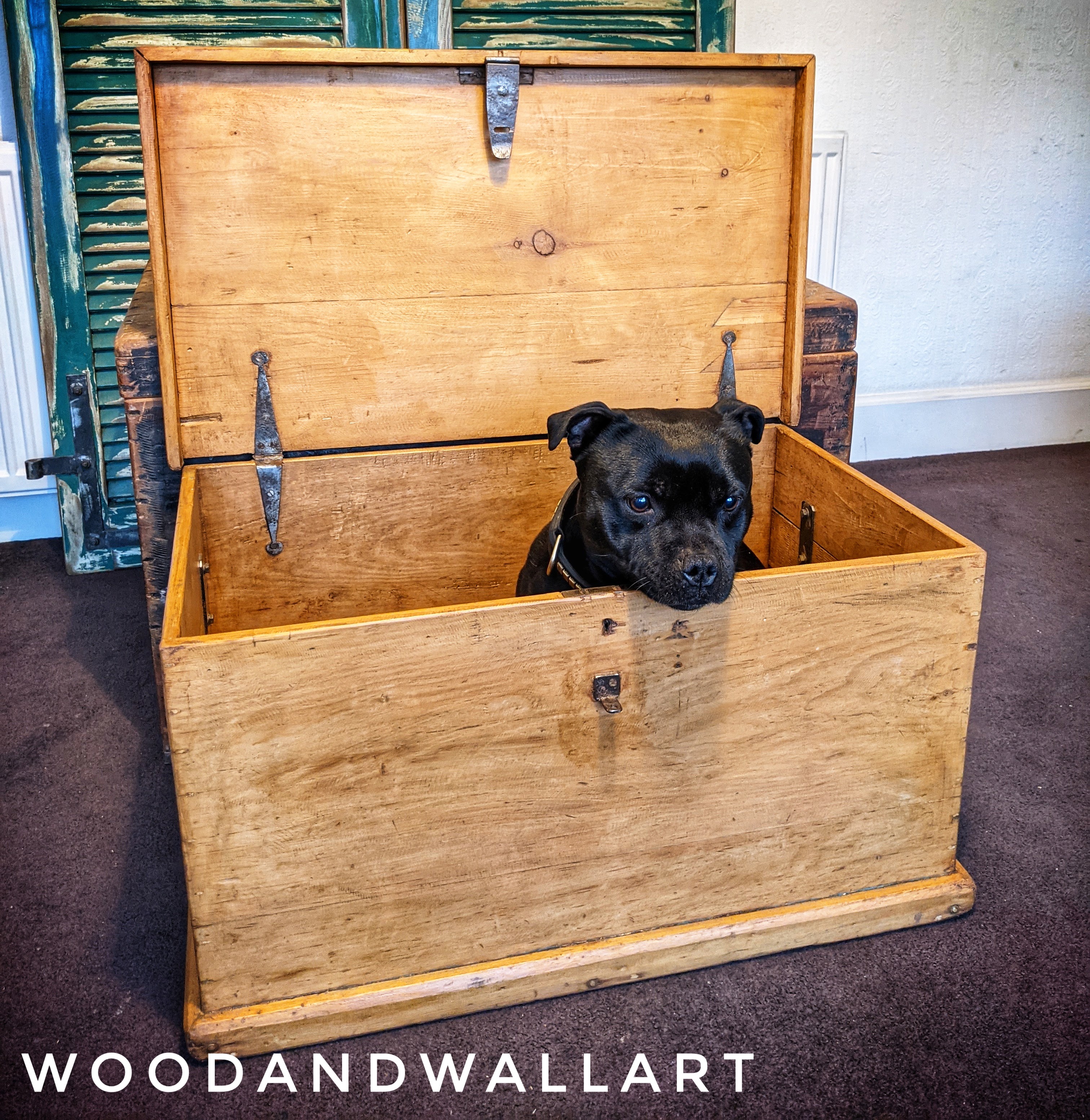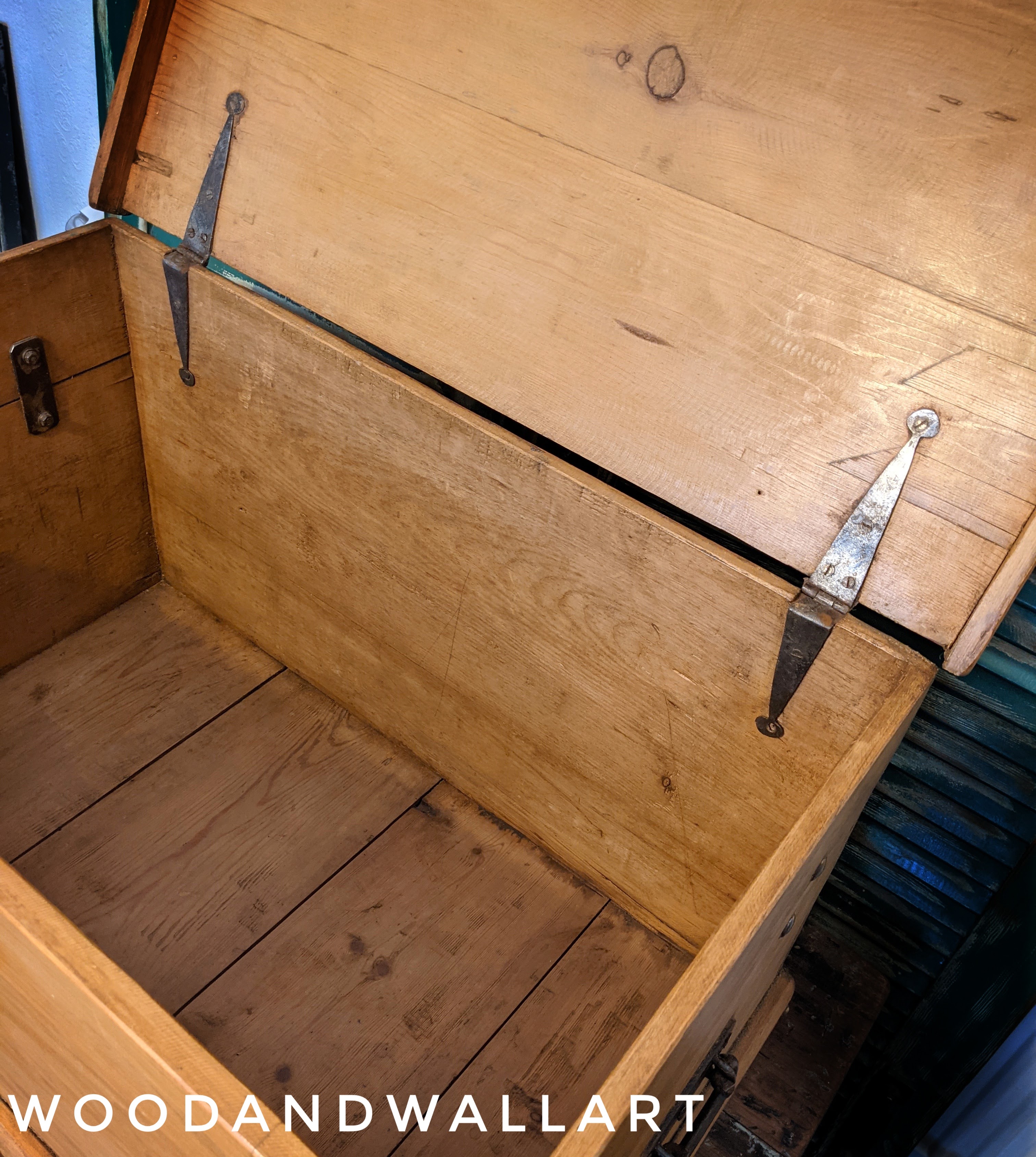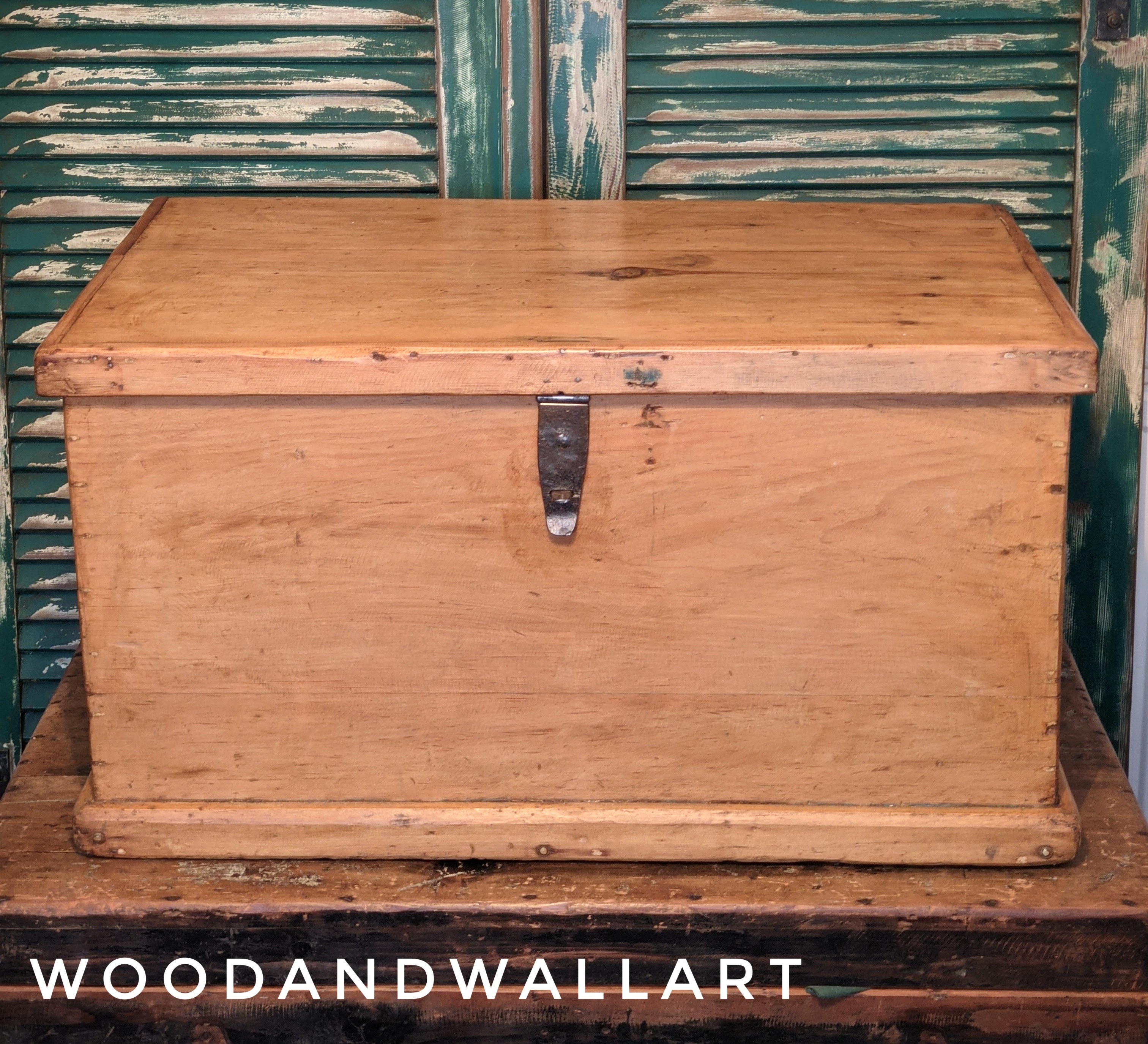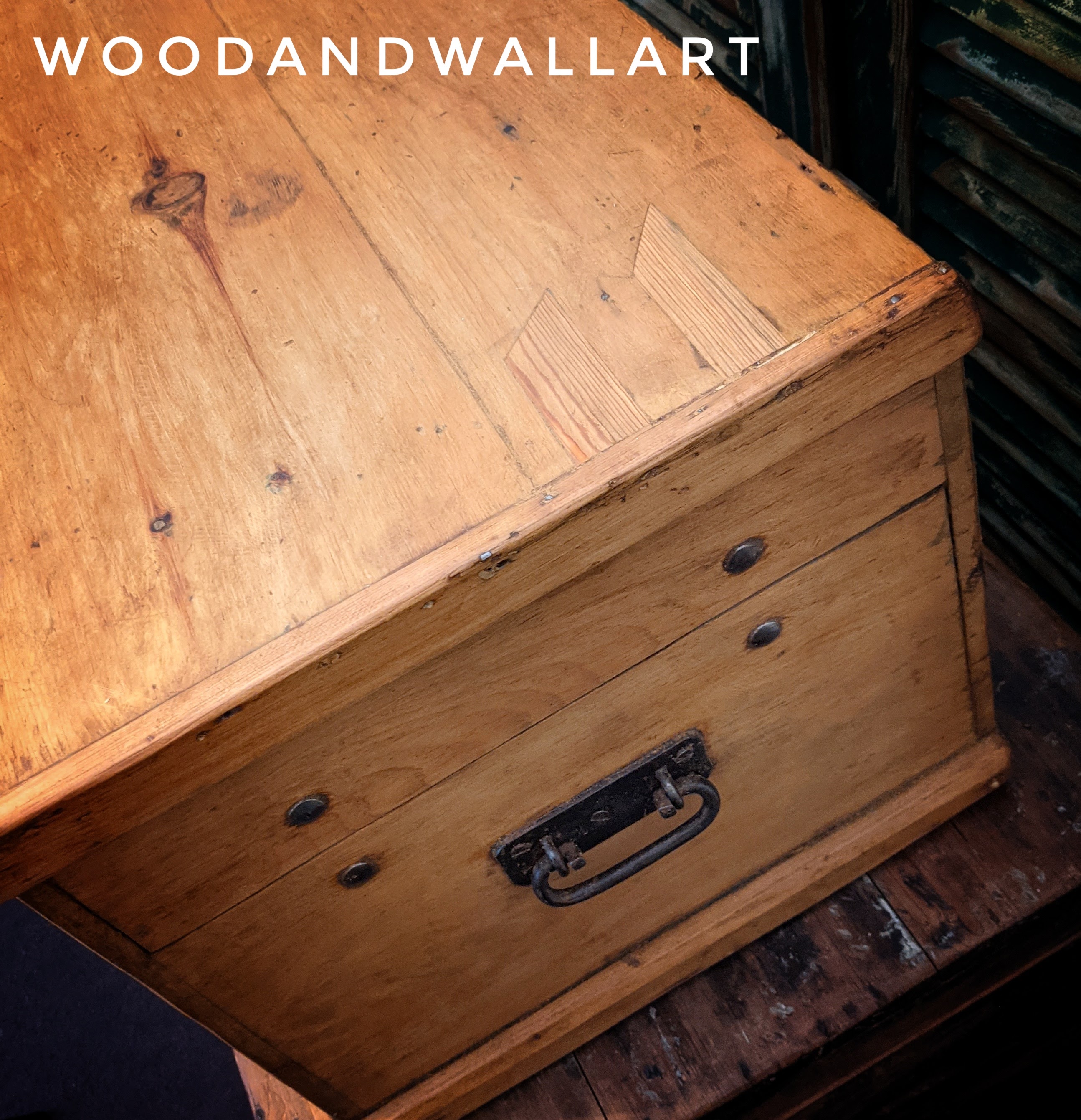 Antique pine chest bags of character including scarf repairs, iron work, great patina achieved over the years. height 42 cm length 77 cm width 45 cm