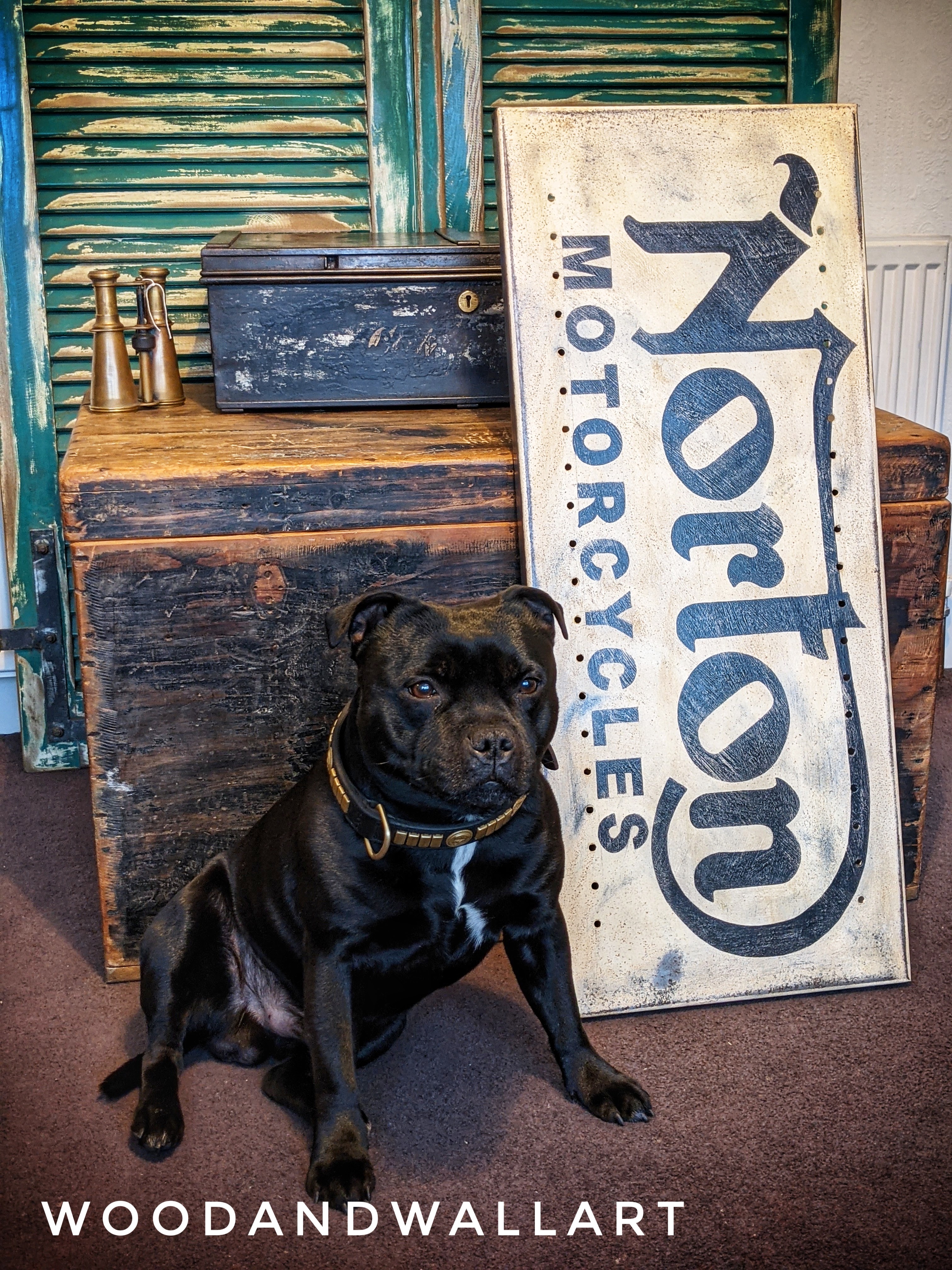 Norton motorcycle sign, retro sign written on vintage steel, excellent patina, decorative, prop ETC length 91 cm height 38 cm £55.00