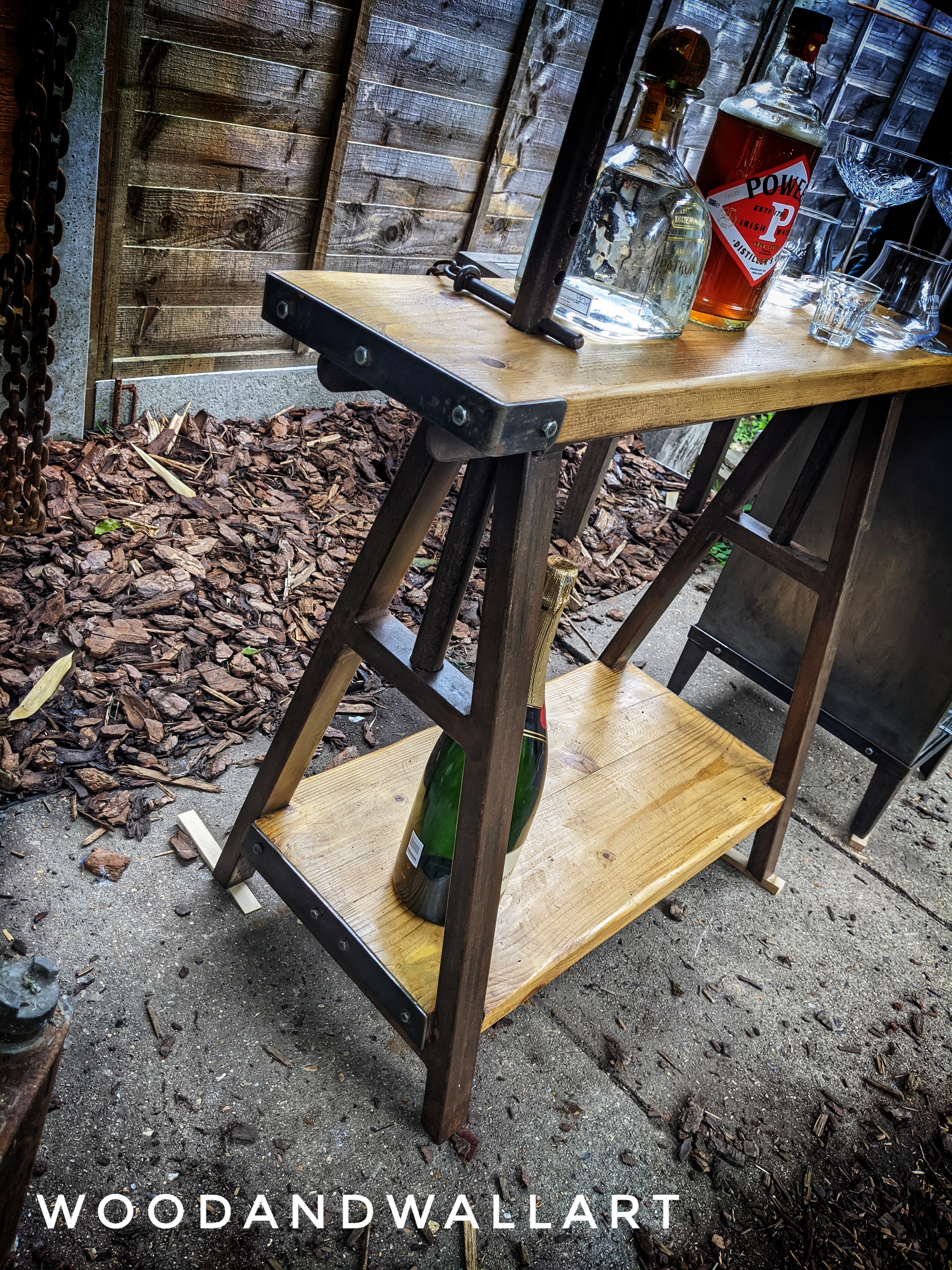 Industrial style shelving unit, industrial vintage steel trestle with solid wood shelves banded with steel traditionally finished with a water and heat resistant hard wax ideal bar or TV entertainments sand or commercial display would look good in any setting