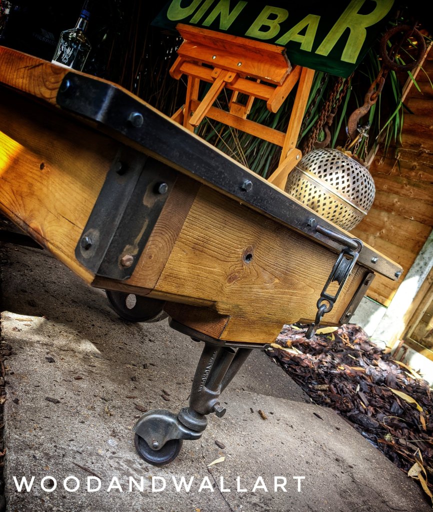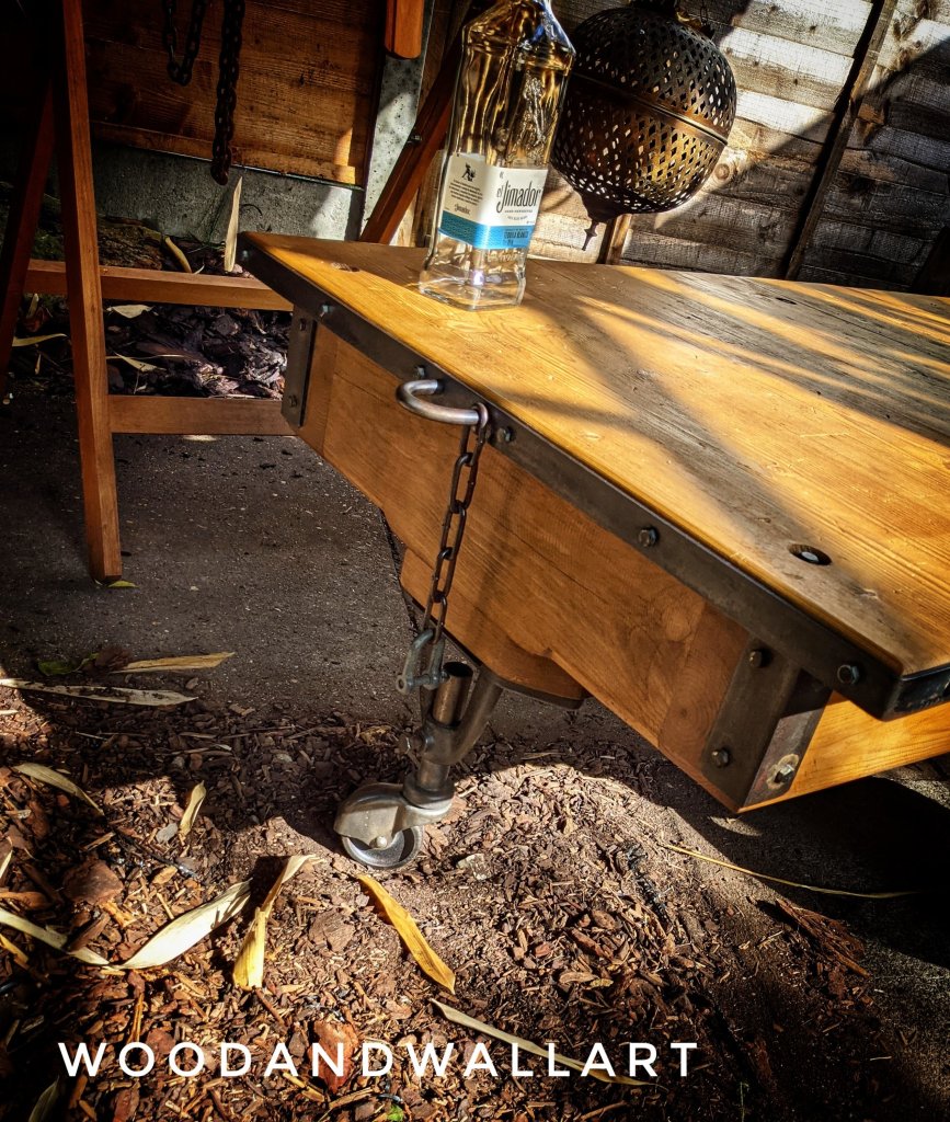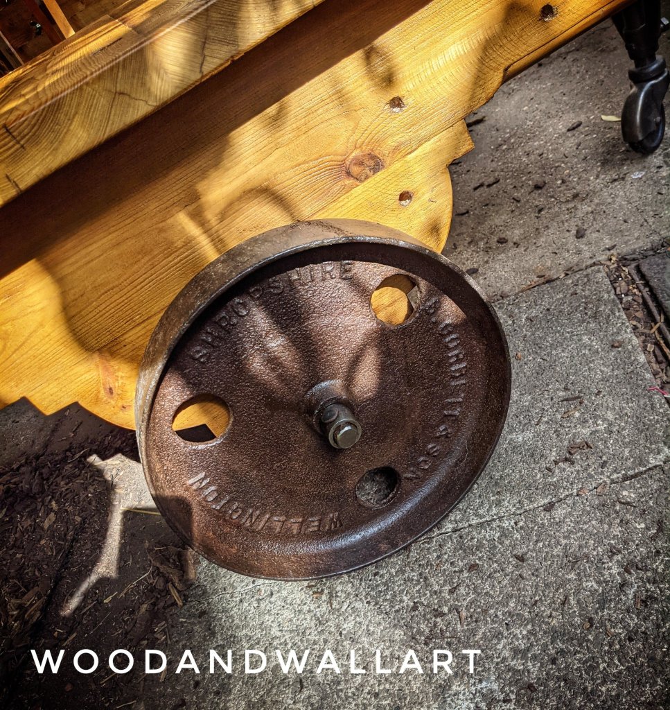 Industrial chic coffee/cart table. lovely old vintage cast iron wheels with vintage adjustable jockey castors excellent patina ldeal coffee table easily wheeled from room to room, suit all interiors, ideal for display or retail setting size 123 cm long 76 cm wide 18 cm high (SOLD)