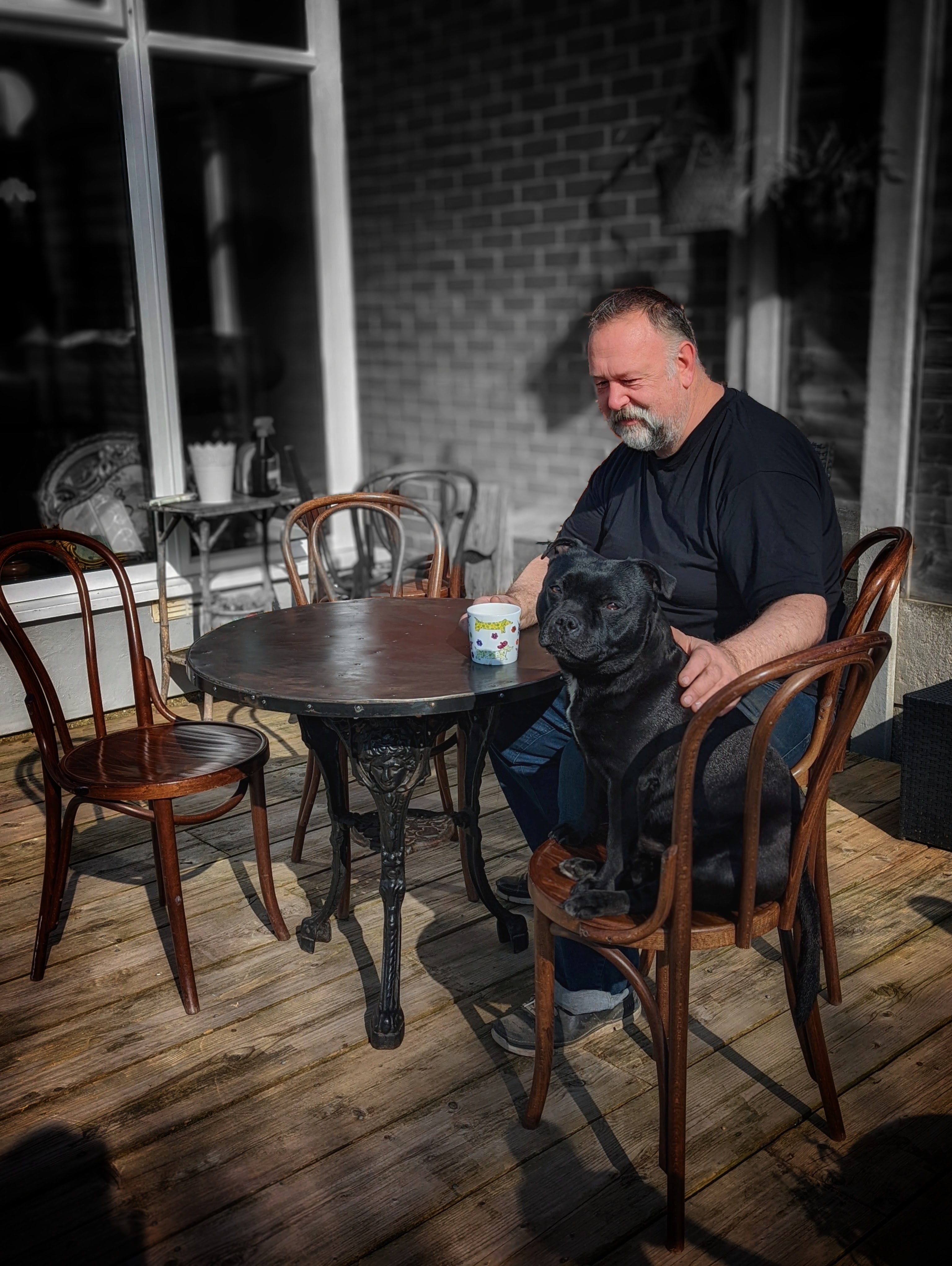 The sun is out what could be better than a cuppa with my little mate Bill, table and chairs for sale but the dog is priceless