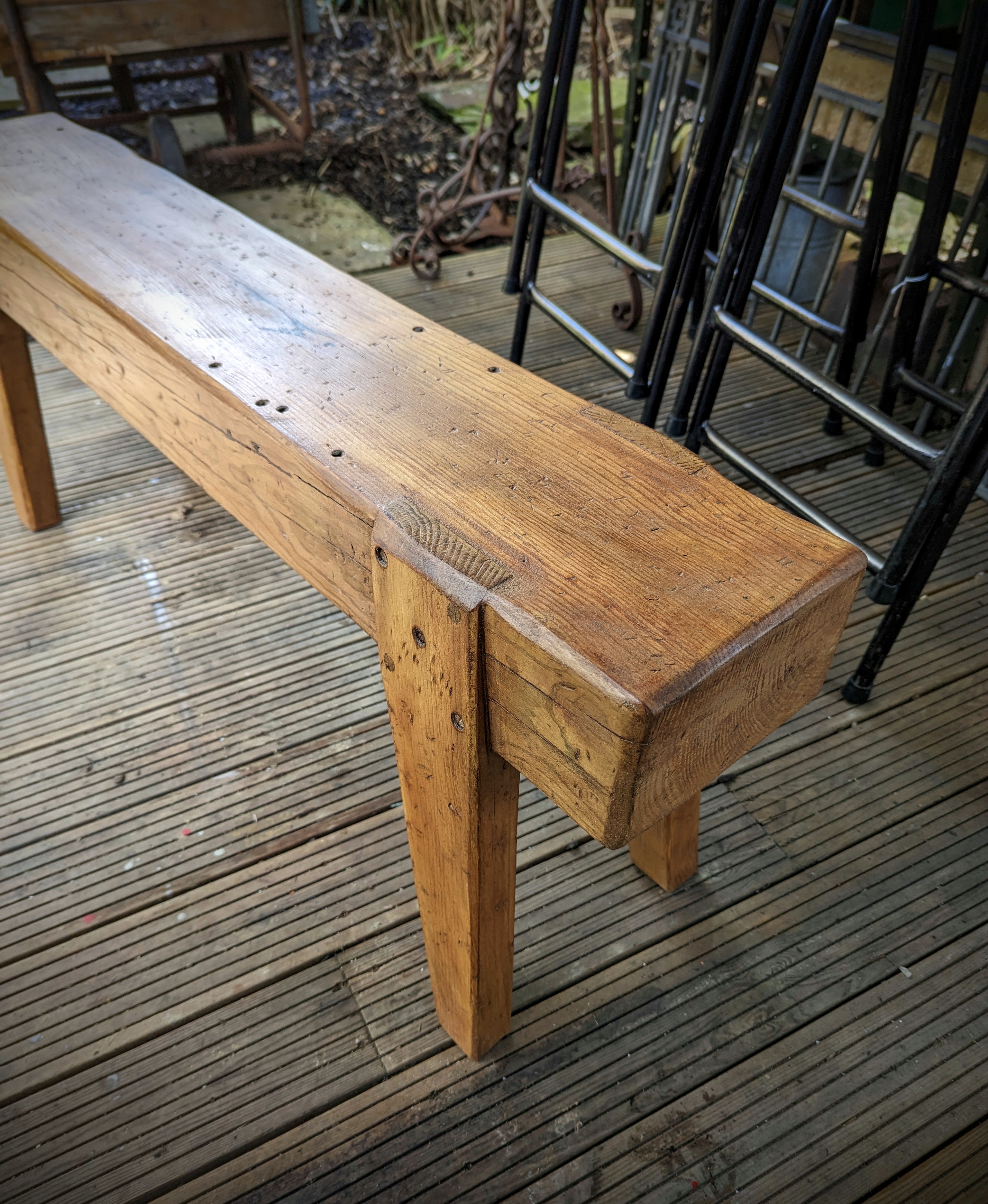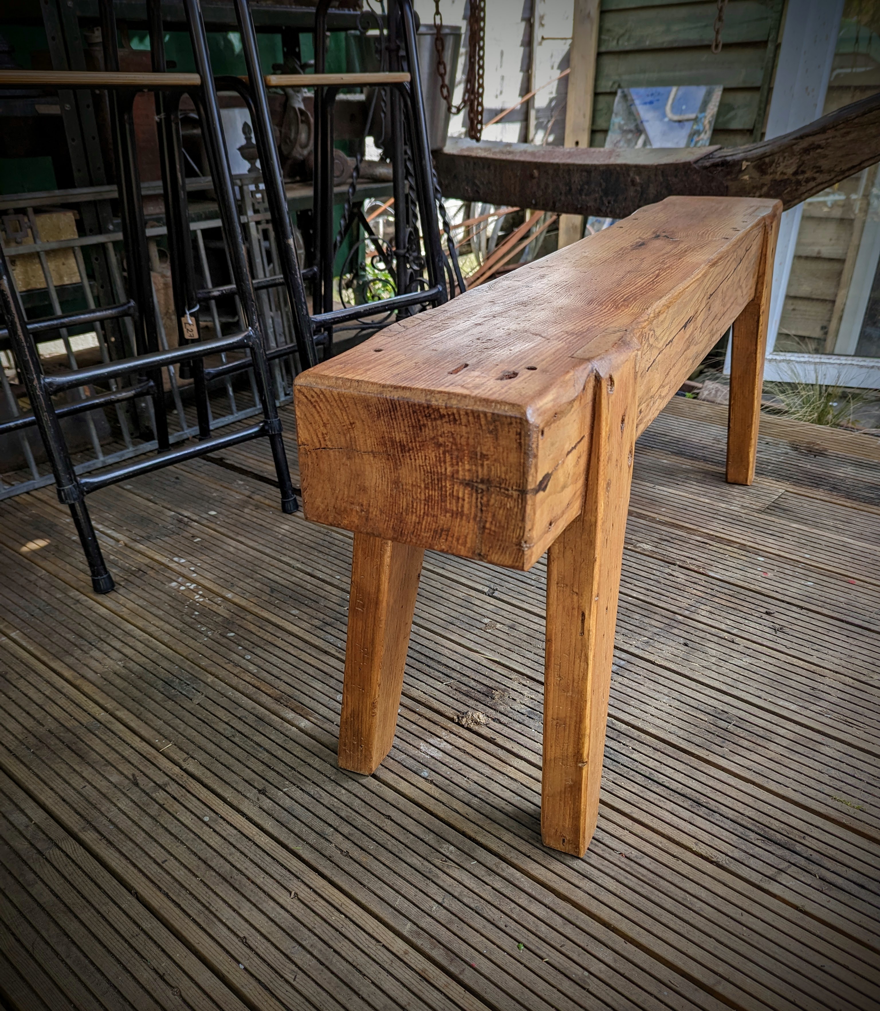 Vintage/antique study solid wood carpenters trestle excellent patina achieved over many years. cleaned. traditionally wax polished ready for the home or any setting, ideal bench height. height 46cm, width at the base 28cm, length 115cm (SOLD)