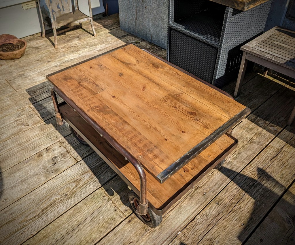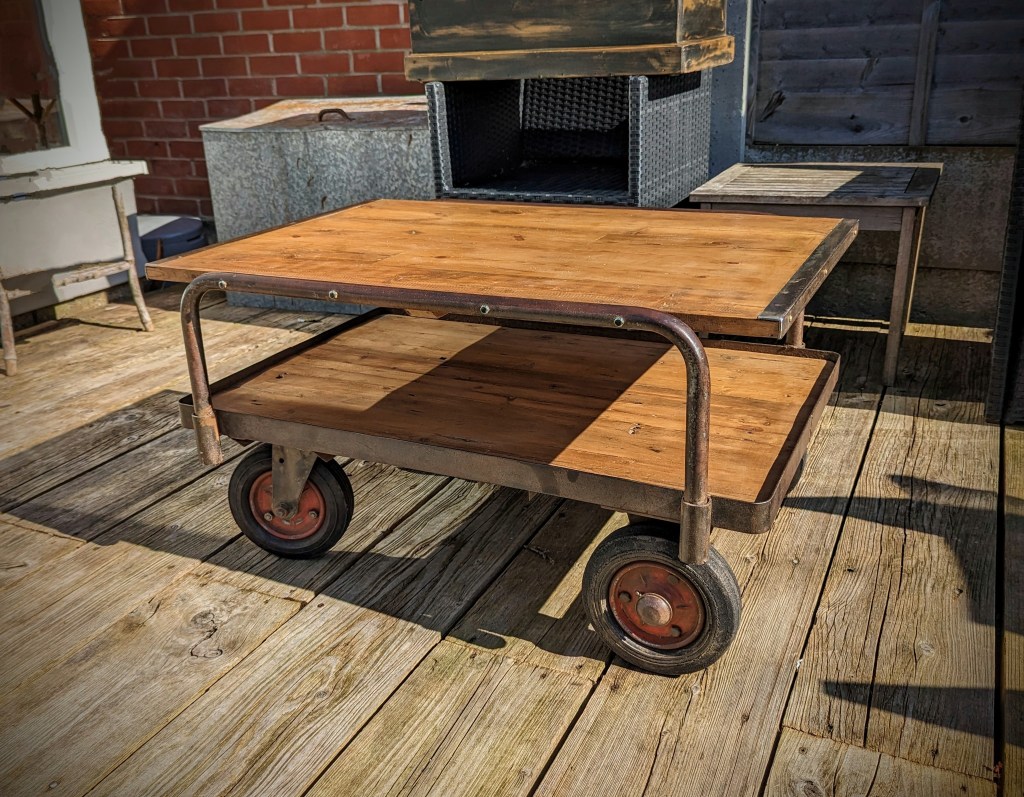 Vintage Industrial chic factory trolley, great patina traditionally polished, make a great coffee table TV media stand or retail use