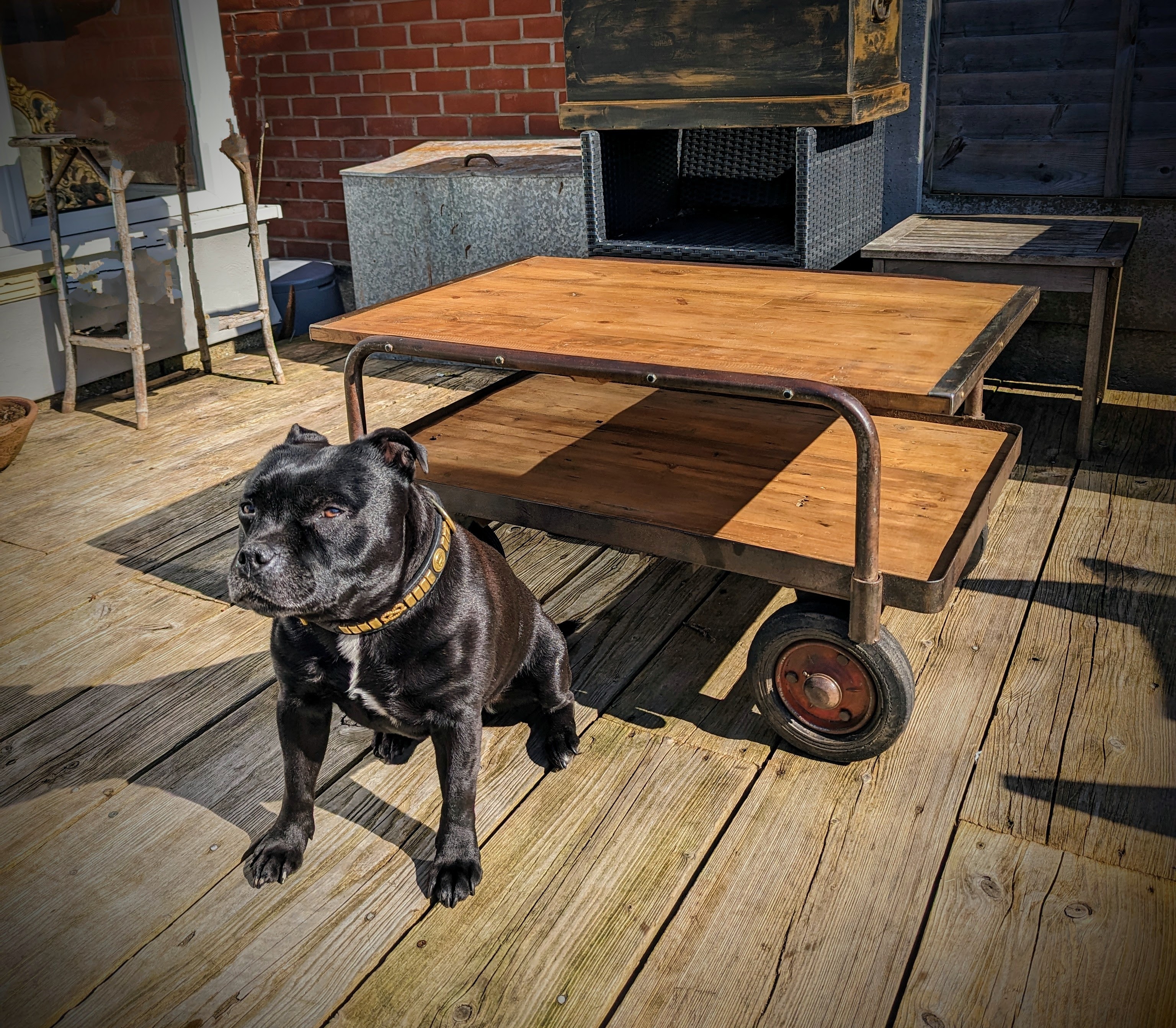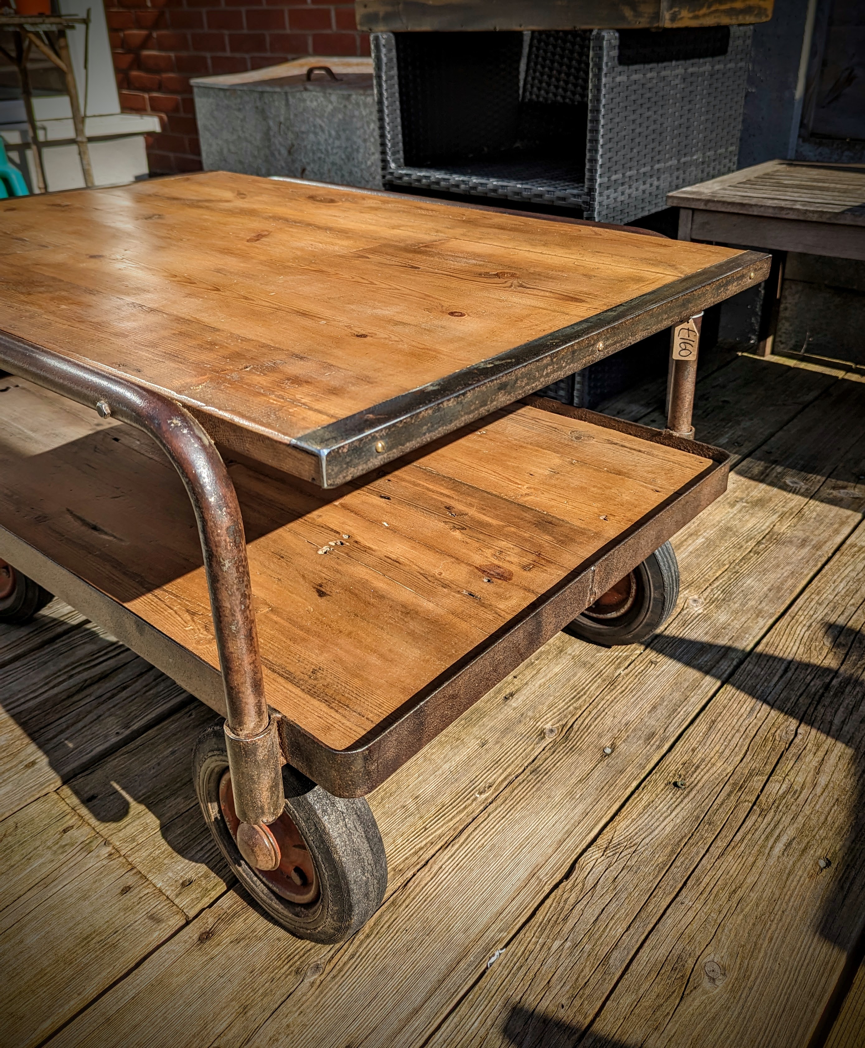 Vintage Industrial chic factory trolley, great patina traditionally polished, make a great coffee table TV media stand or retail use