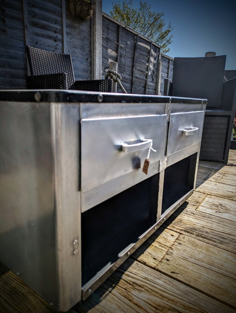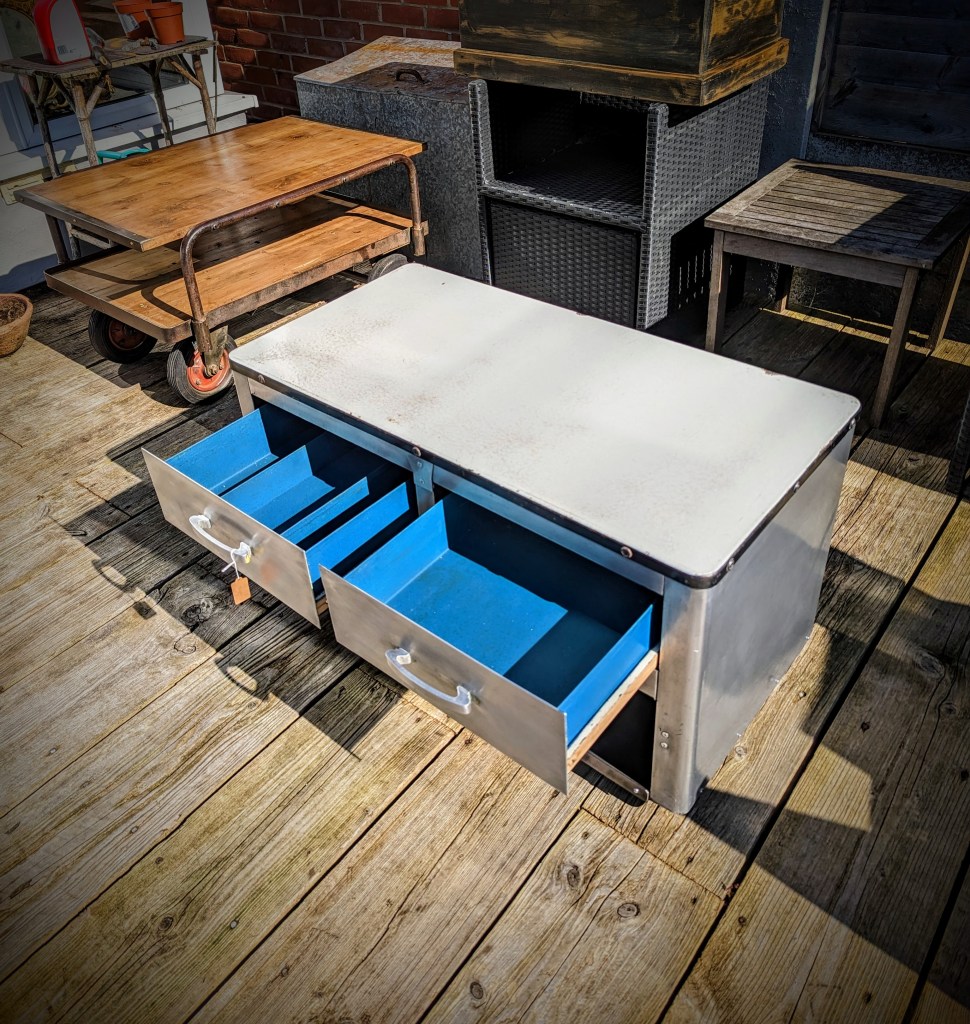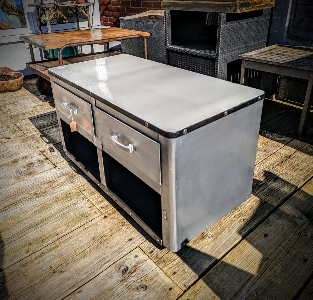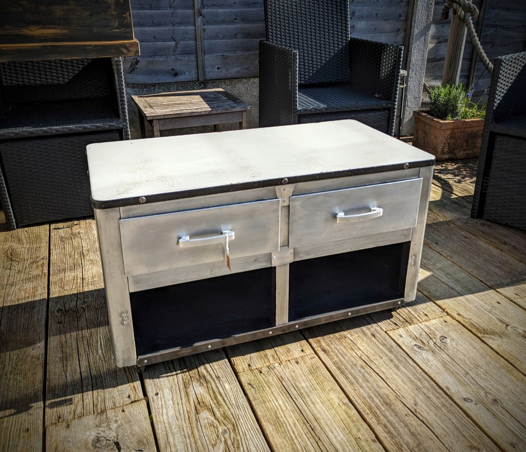Vintage polished aluminum cabinet, originally made from aircraft aluminum after the 2nd world war, now a great retro coffee table, TV stand, media stand with storage