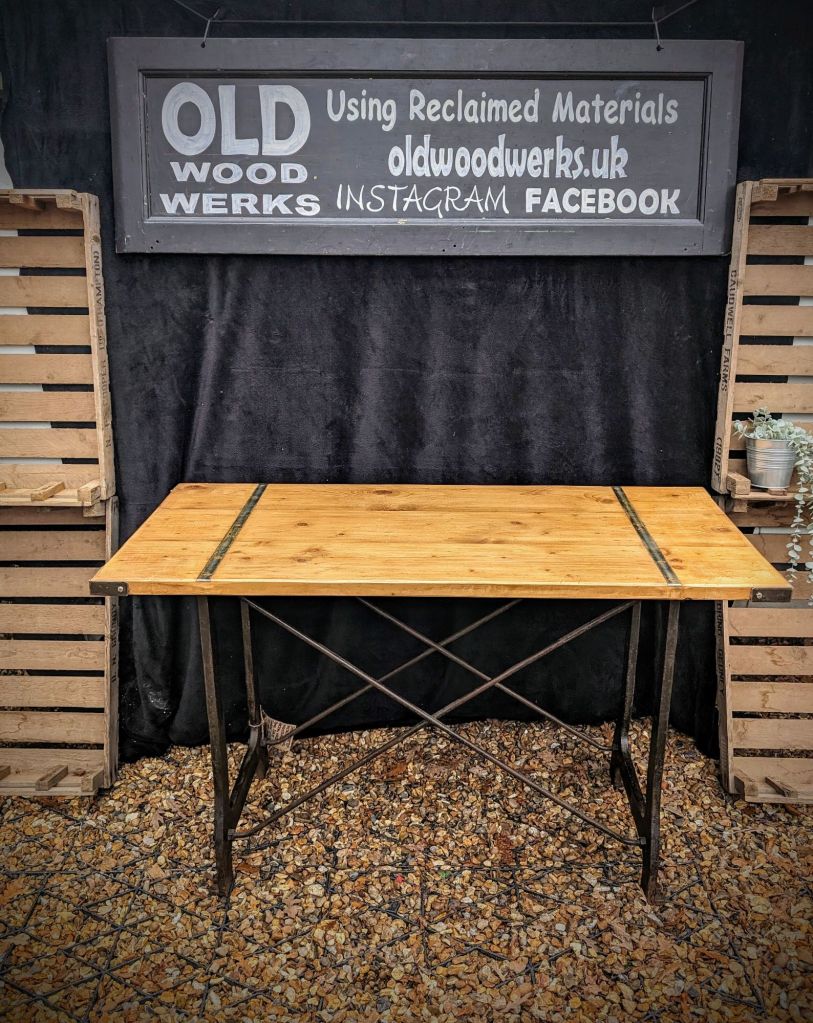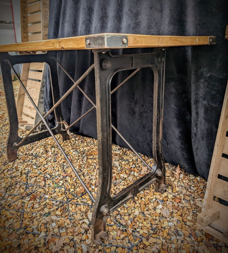 Industrial chic table, vintage factory cast iron base with a reclaimed solid wood top fished with steel straps and corners, bags of character with this piece great patina Height 78 cm Length 134 cm Width 64 cm £195.00